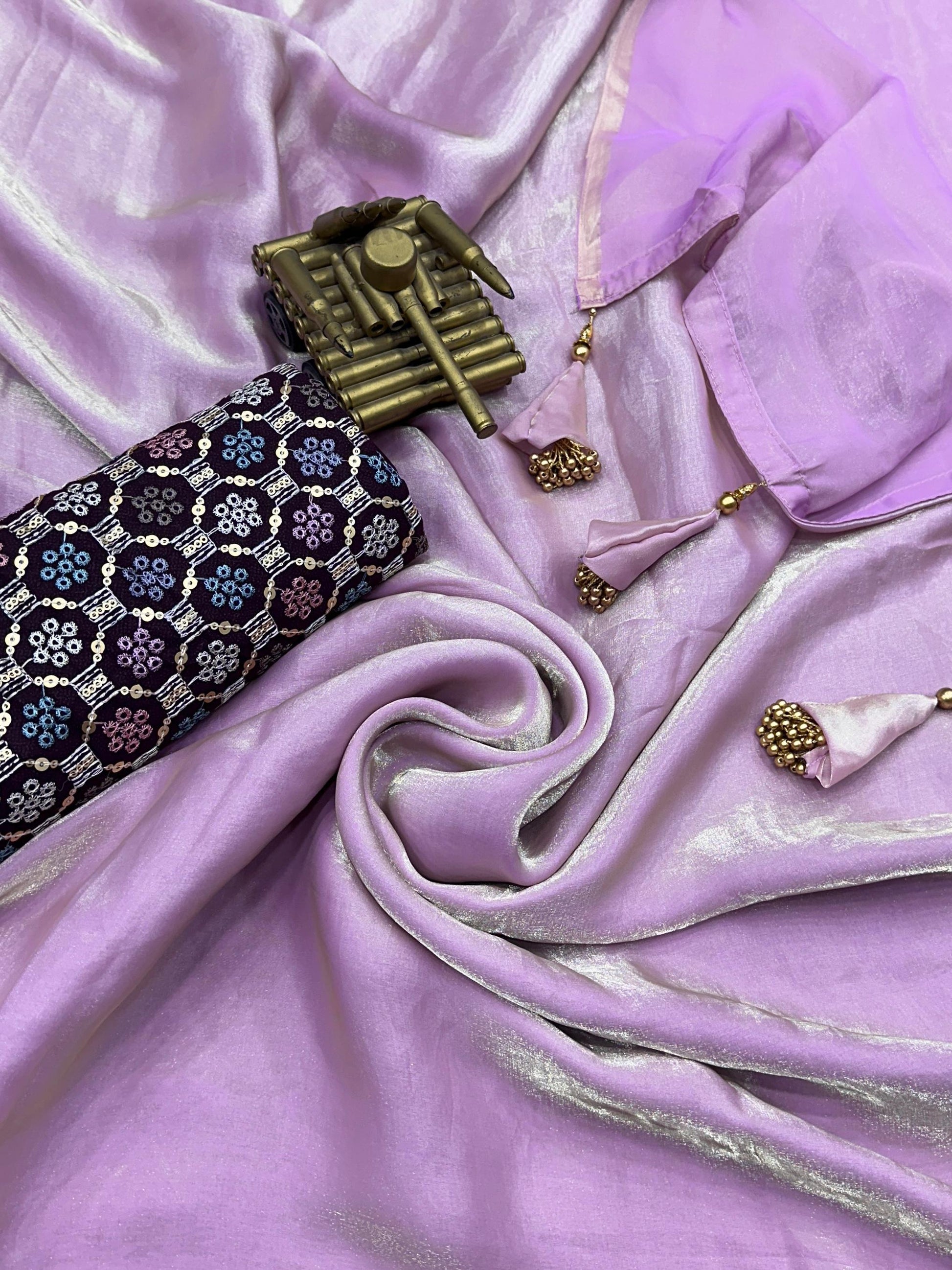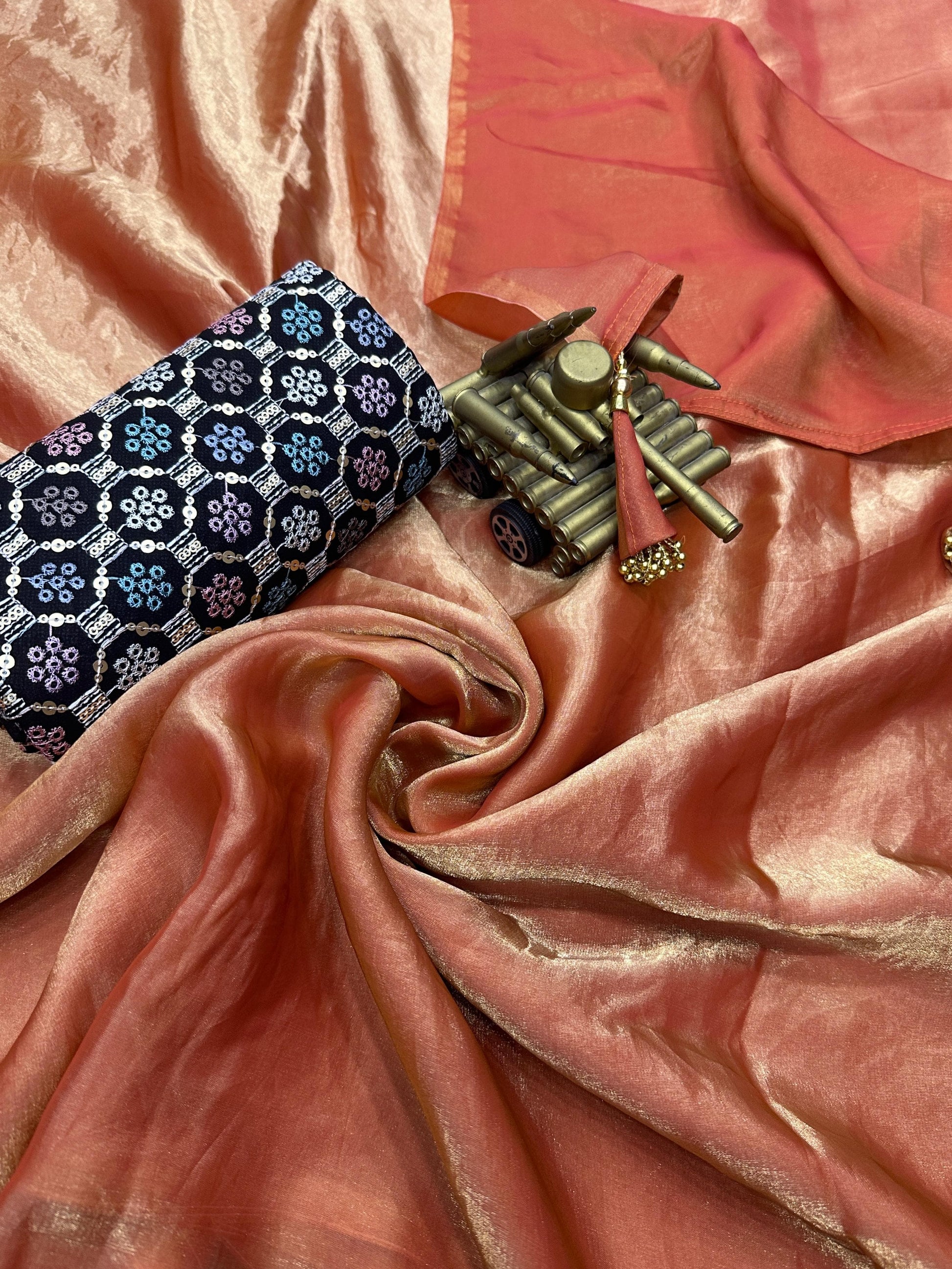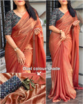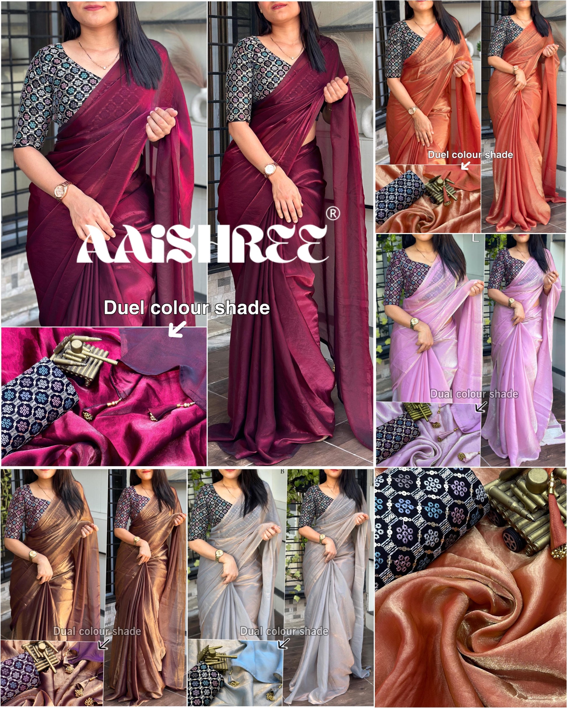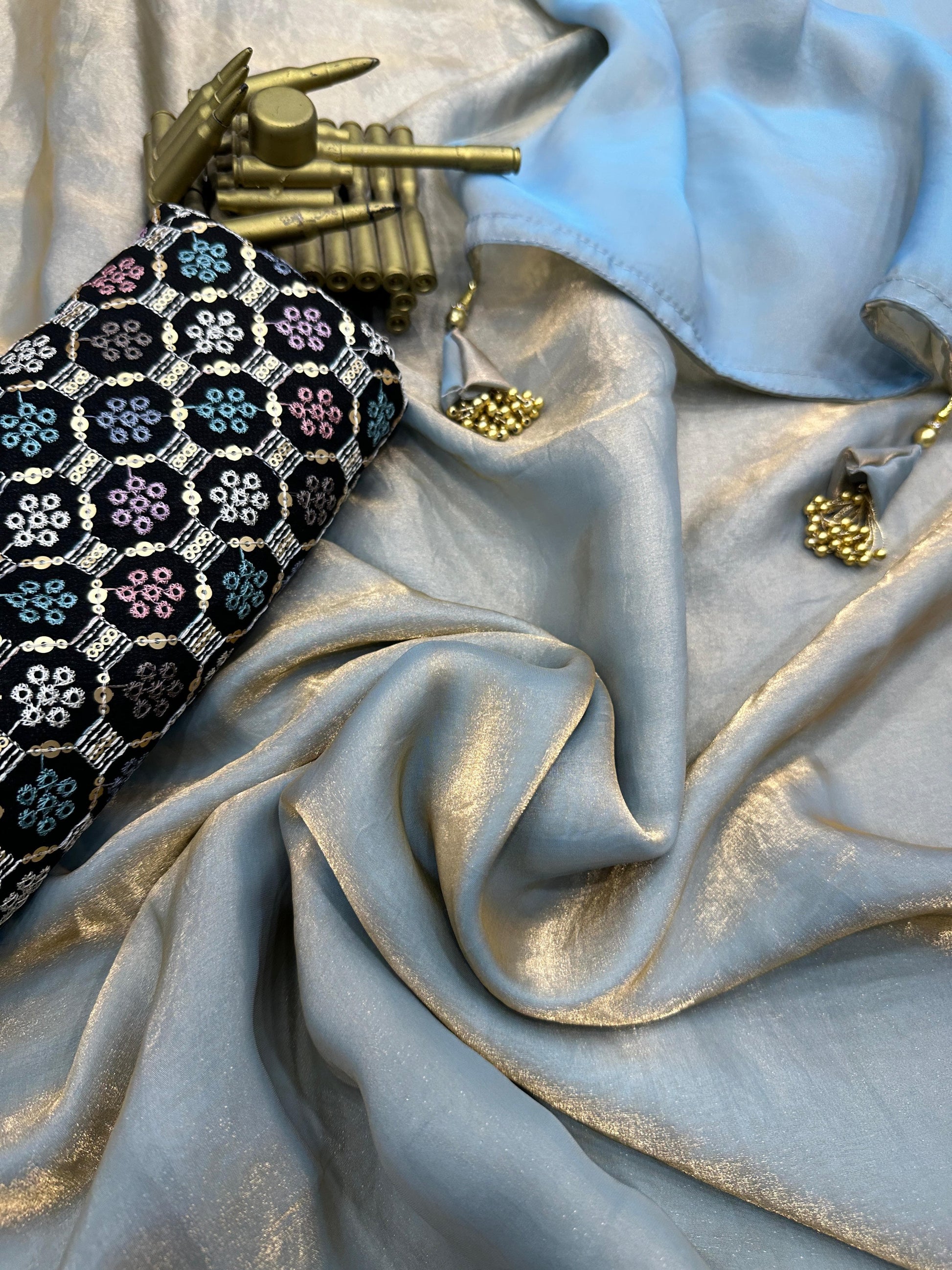 | Work | Saree- Dual shade saree with fancy pearl tussles Blouse- multi colored thread embroidered work and Matt gold sequins. |
